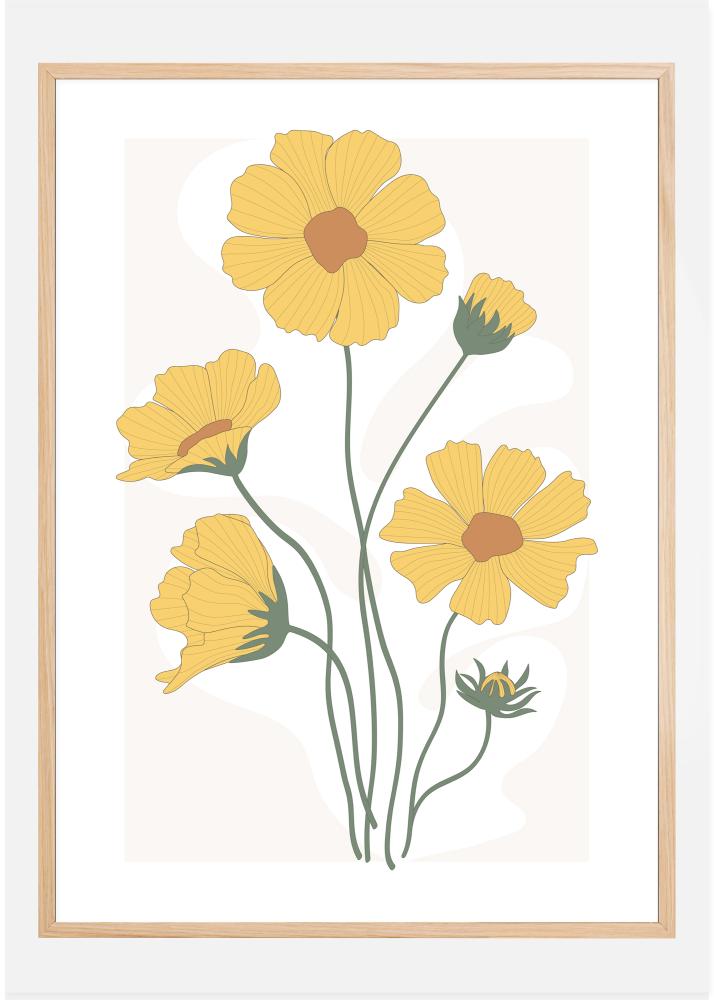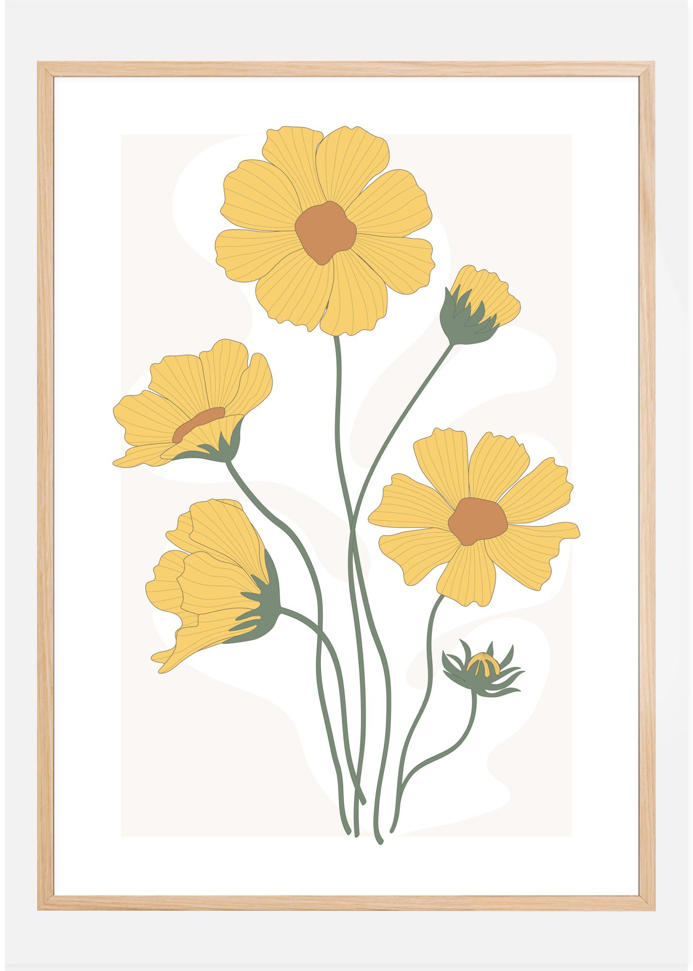 Un póster brillante con caléndulas amarillas creado en un estilo de impresión divertido. Cada una de las flores resalta en el fondo blanco. A pesar de ser un diseño elegante y sencillo, las flores son alegres y la forma perfecta de despertar con una sonrisa en los labios.