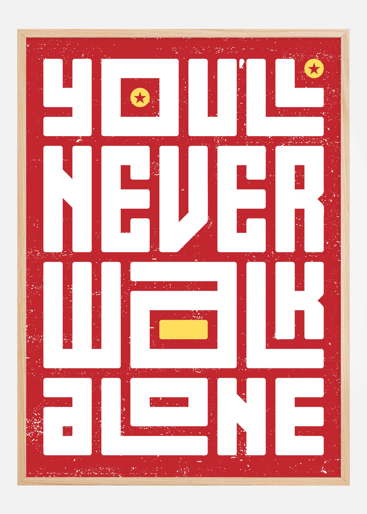 Este póster enérgico y estimulante irradia una fuerte presencia con su audaz y bloqueada tipografía que resalta el mensaje "You'll Never Walk Alone" en brillantes letras blancas sobre un poderoso fondo rojo. Las grandes letras están cuidadosamente dispuestas para maximizar su efecto visual y están adornadas con estrellas doradas y una forma rectangular que rompe el bloque de texto, lo que añade una dimensión adicional al diseño.