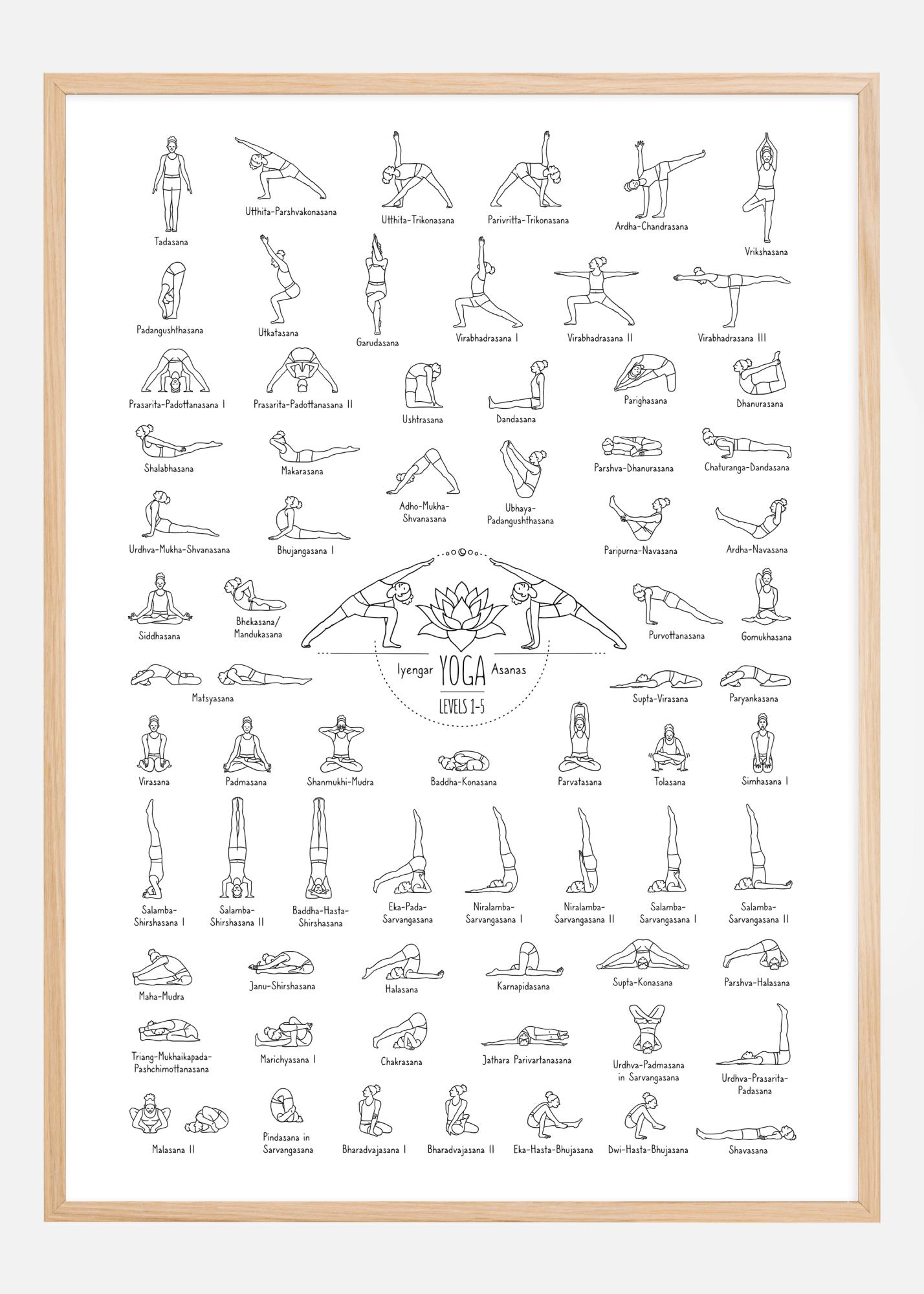 La parte central del póster está dedicada a Iyengar Yoga Asanas para nivel 1-5, indicando una progresión en la práctica. Este póster no solo es funcional, sino también estéticamente atractivo, y es ideal para un estudio de yoga, un gimnasio en casa, o como fuente de inspiración en un rincón relajante del hogar. Su diseño minimalista en blanco y negro lo hace compatible con una variedad de estilos de decoración, al mismo tiempo que transmite una sensación de calma y enfoque.