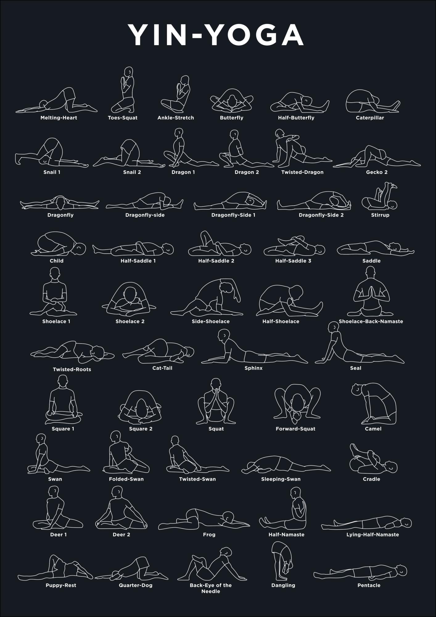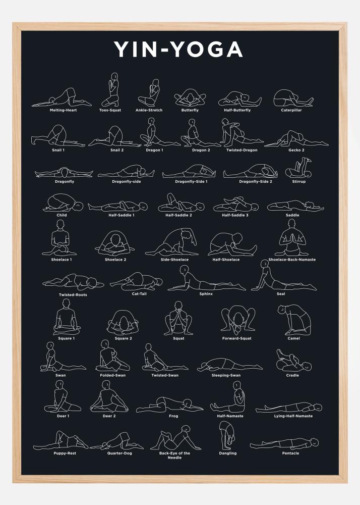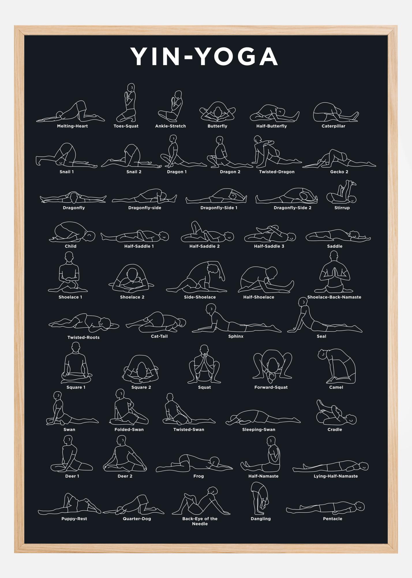 Un póster útil con las diferentes posiciones de yoga que existen. Figuras blancas dibujadas en las diferentes posiciones sobre un fondo azul marino sencillo, con el nombre de la posición escrito debajo. Prepárate para estirarte al máximo cuando cuelgues esto en la pared para motivarte.