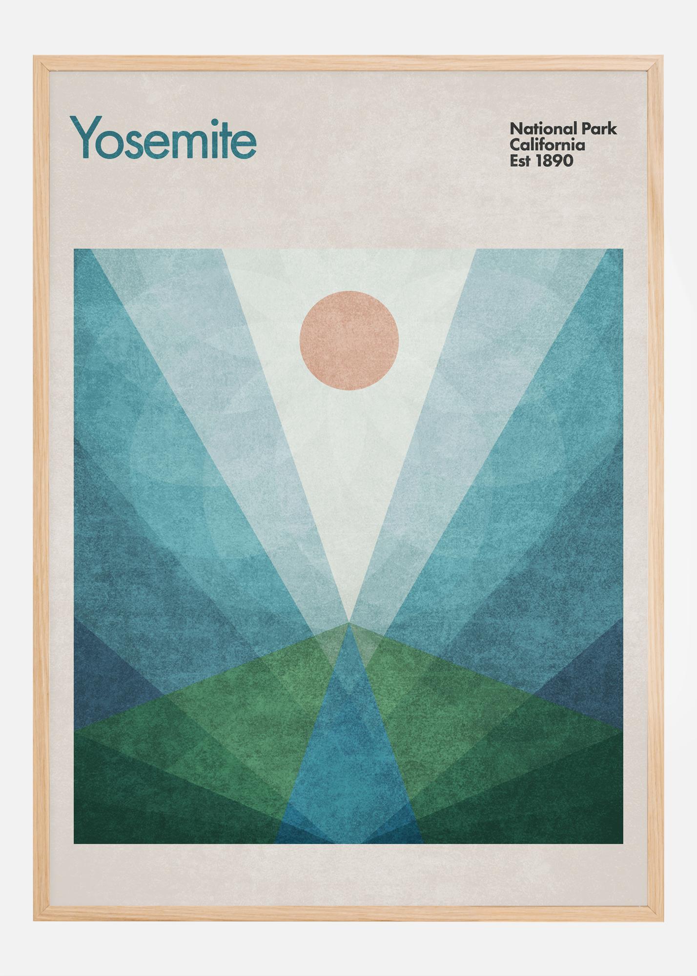 Este póster captura el espíritu del Parque Nacional de Yosemite con un diseño geométrico que refleja los majestuosos e icónicos paisajes del parque. Con una paleta de colores que recuerda a cielos despejados y valles exuberantes, el texto "Yosemite National Park California Est 1890" rinde homenaje a la larga historia del parque como un parque nacional y un tesoro natural.