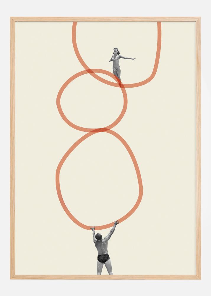 Este cartel único presenta una composición que se asemeja a una danza de contornos e interacción humana. La imagen muestra a una persona en un movimiento envolvente, equilibrada por otra figura que se mantiene fuerte y firme en el suelo, ambas enmarcadas por círculos de color terracota flotante que crean una sensación de movimiento y continuidad.