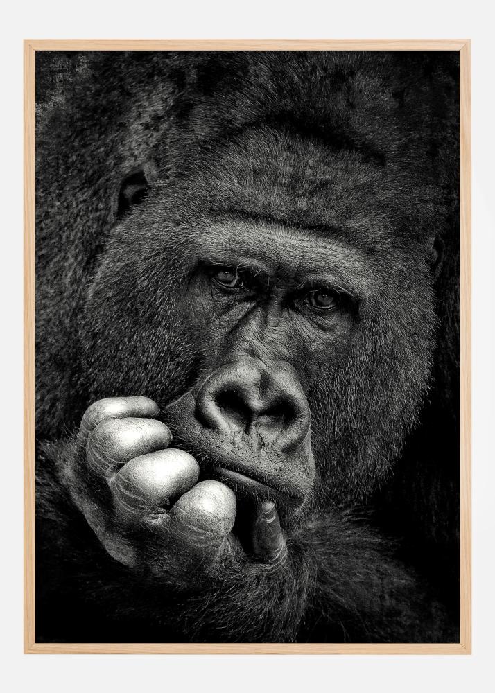 Un fantástico póster de retrato de un gorila en una pose contemplativa. El gorila mira con la mirada desenfocada hacia la cámara. Una de sus manos está curvada debajo de la barbilla como si estuviera reflexionando sobre cuestiones importantes. La impresión en blanco y negro resalta todos los detalles en la cara de este fantástico simio humano.