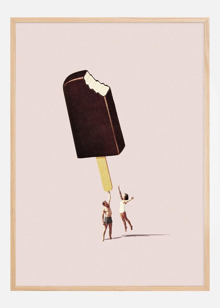 Este encantador póster muestra una imagen única y juguetona de dos personas que parecen haber encontrado un helado de palito gigante. Con su composición imaginativa y un fondo cálido de color rosa pastel, esta imagen ofrece una sensación de alegría veraniega y nostalgia. Las figuras alegres, vestidas con trajes de baño sencillos, se estiran hacia el helado, que tiene una apariencia realista con un mordisco, creando un hermoso contraste con el entorno minimalista. Esta escena creativa y animada captura la atención del espectador y evoca recuerdos de días soleados.