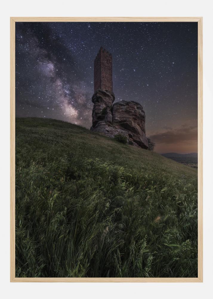 Un magnífico póster con el castillo de Zafra por la noche. Mira hacia arriba a esta antigua construcción de piedra desde el fondo de una colina cubierta de hierba. La torre se eleva hacia el cielo nocturno donde la Vía Láctea forma un arco sobre el cielo. Esta hermosa imagen lucirá bien en cualquier pared de tu hogar y también le dará un toque mágico.
